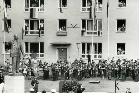 An seiner Stelle entstand das erste Denkmal der DDR für Ernst Thälmann (1886-1944), den am 18. August 1944 in Buchenwald ermordeten Reichstagsabgeordneten und Vorsitzenden der KPD. Es stammt vom Dresdener Bildhauer Walter Arnold und zeigt Ernst Thälmann als kämpferischen Redner in seiner Zeit als Politiker der Weimarer Republik. Am 17. August 1958 wurde die Statue feierlich enthüllt. Die Mauer, die den Platz nach Westen begrenzt, trägt die Inschrift: „Aus Eurem Opfertod wächst unsere sozialistische Tat.“